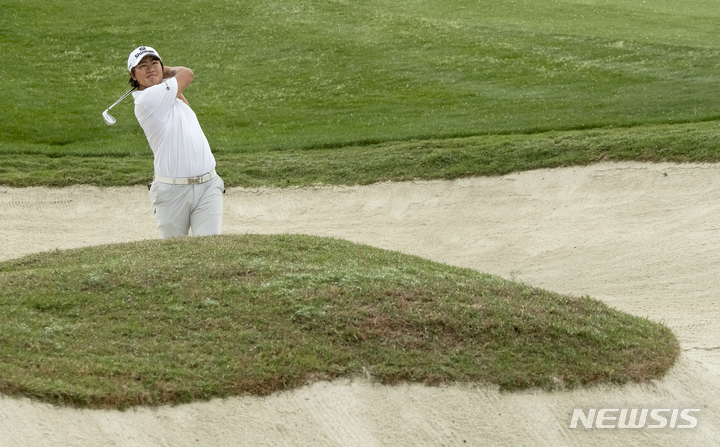 [샌안토니오=AP/뉴시스] 김성현이 30일(현지시간) 미 텍사스주 샌안토니오의 TPC 샌안토니오 오크스 코스에서 열린 미국프로골프(PGA) 투어 발레로 텍사스오픈 첫날 15번 페어웨이 벙커에서 샷하고 있다. 올해 첫 메이저대회 마스터스 토너먼트 출전권 획득에 나선 김성현은 이븐파로 첫날을 마쳤다. 2023.03.31.