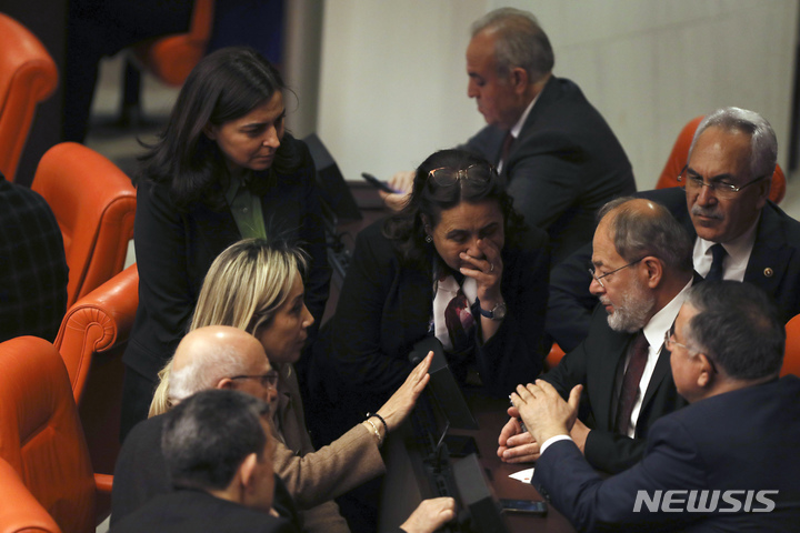 [앙카라=AP/뉴시스] 30일(현지시간) 튀르키예 앙카라 의회에서 집권당인 정의개발당 소속 의원들이 핀란드의  북대서양조약기구(나토) 가입 비준안 투표에 앞서 얘기를 나누고 있다. 헝가리 국회가 핀란드의 나토 가입안을 비준한 지 사흘 만에 튀르키예 의원 276명 전원이 이를 찬성했으며 스웨덴에 대한 비준은 유예 중이다. 2023.03.31.