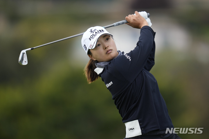 [팔로스 버디스=AP/뉴시스] 고진영이 30일(현지시간) 미 캘리포니아주 팔로스 버디스 골프클럽에서 열린 미여자프로골프(LPGA)투어 디오임플란트LA오픈 첫날 17번 홀에서 티샷하고 있다. 고진영은 일부 선수의 경기가 남은 현재 1오버파 공동 47위권에 이름을 올렸다. 2023.03.31.