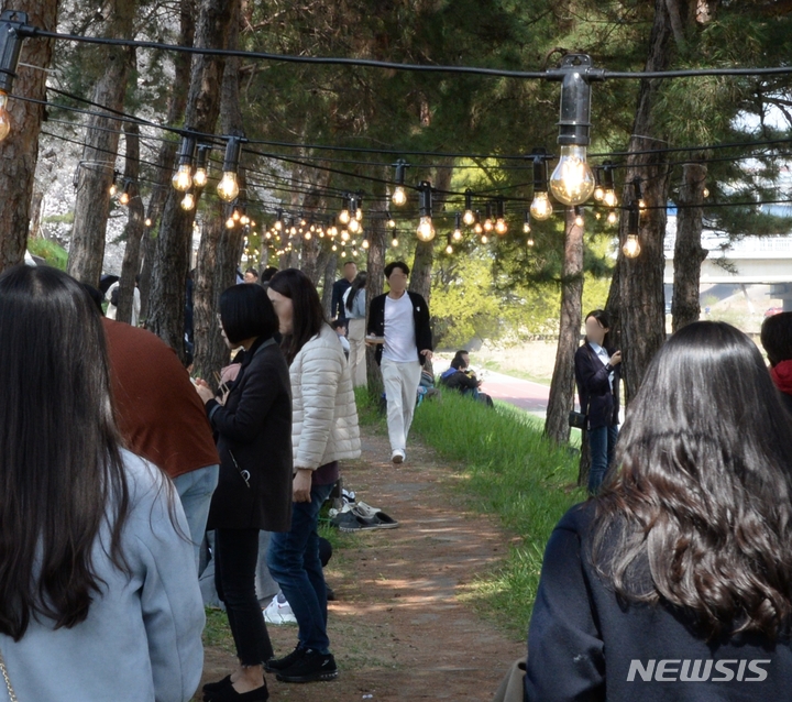 [청주=뉴시스] 조성현 기자 = 31일 오후 충북 청주시 상당구 무심천변에서 시민들이 '1회 벚꽃과 함께하는 푸드트럭 축제'를 즐기고 있다. 2023.03.31. [email protected]