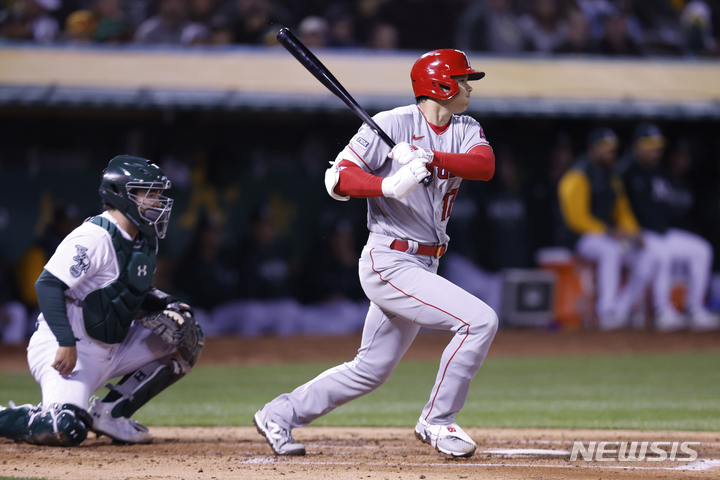 [오클랜드=AP/뉴시스] 로스앤젤레스 에인절스의 오타니 쇼헤이가 30일(현지시간) 미 캘리포니아주 오클랜드의 링센트럴 콜리세움에서 열린 2023 메이저리그(MLB) 오클랜드 애슬레틱스와의 개막전 4회 초 안타를 치고 있다. 투타 겸업 오타니는 6이닝 10K 무실점 1안타 1볼넷으로 활약했지만 후속 투수들이 실점하면서 1-2로 패했다. 2023.03.31.
