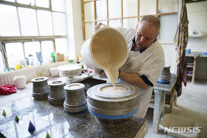 [스토크온트렌트=AP/뉴시스] 30일(현지시간) 영국 스토크 온 트렌트에 있는 '더치스 차이나 1888' 공장에서 이곳 직원이 도자기용 틀에 재료를 붓고 있다. 스토크 온 트렌트는 영국 도자기 산업의 본고장으로 이 공장은 찰스 3세 국왕 즉위식을 5주 앞두고 역사적인 '갓 세이브 더 킹'(God Save The King) 도자기와 컵 제작에 분주하다. 2023.03.31.