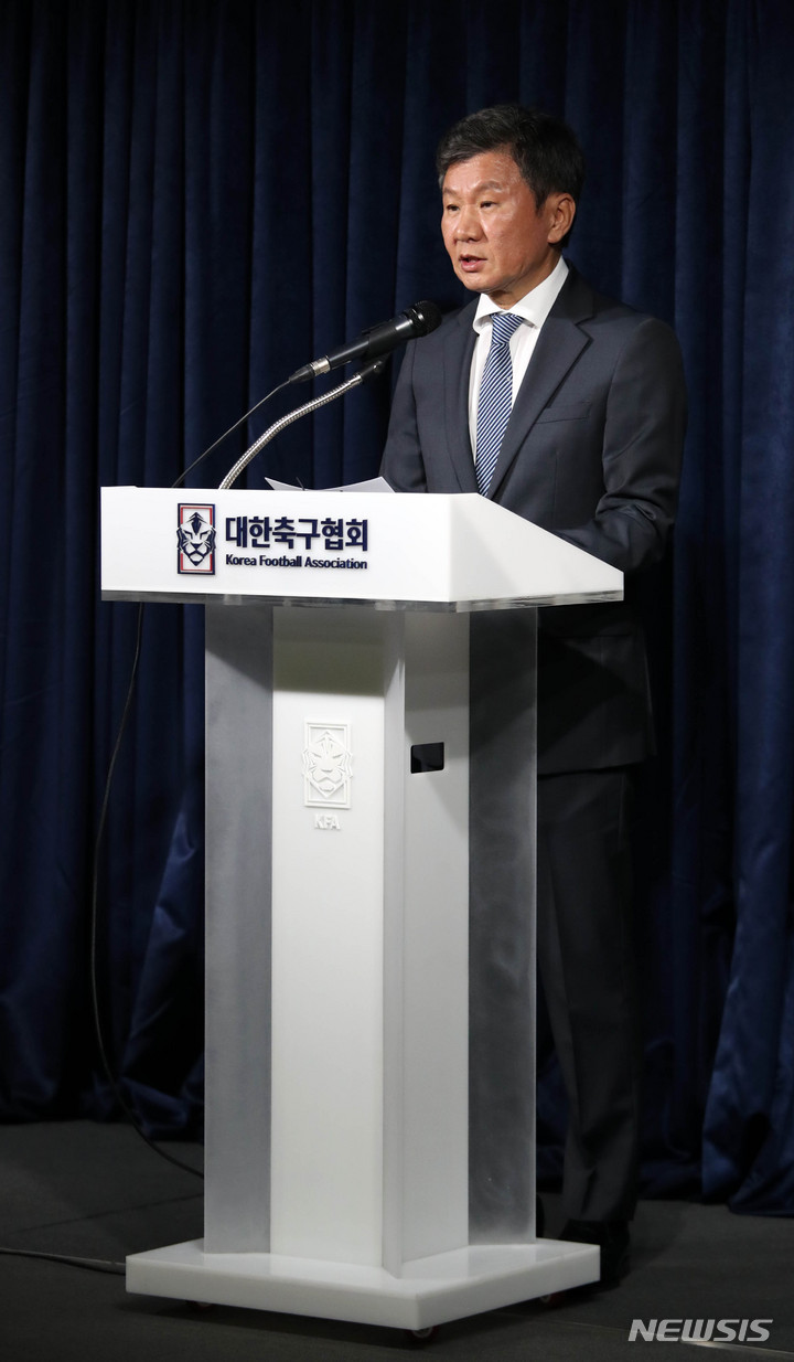 [서울=뉴시스] 김선웅 기자 = 정몽규 대한축구협회 회장이 31일 서울 종로구 축구회관에서 열린 비리 축구인 사면 재논의 임시 이사회를 마친 후 승부조작범 등 사면 전격 철회 입장을 발표하고 있다. 2023.03.31. [email protected]