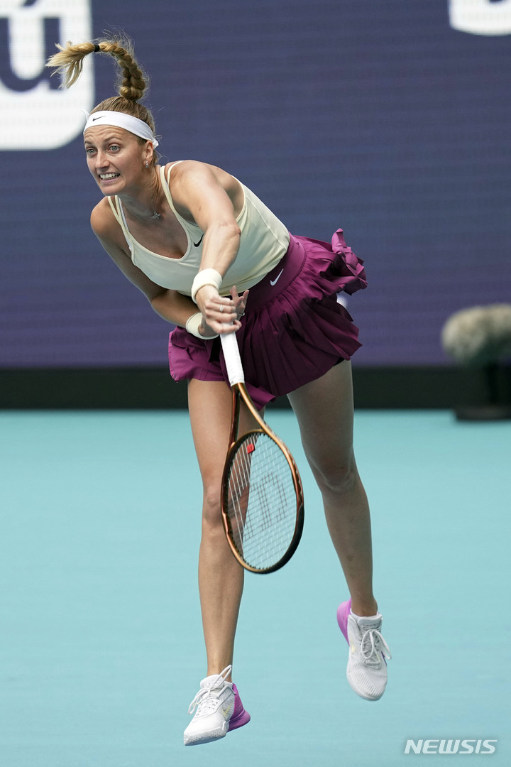 [마이애미=AP/뉴시스] 페트라 크비토바(12위·체코)가 지난달 31일(현지시간) 미 플로리다주 마이애미 가든스에서 열린 여자프로테니스(WTA) 투어 마이애미오픈 단식 준결승전에서 소라나 크르스테아(74위·루마니아)와 경기하고 있다. 크비토바가 2-0(7-5 6-4)으로 승리하고 결승에 올라 엘레나 리바키나(7위·카자흐스탄)와 우승을 다툰다. 2023.04.01.