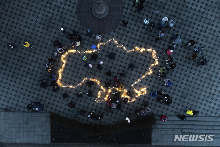 [부차=AP/뉴시스] 지난달 31일(현지시간) 우크라이나 키이우 외곽 부차에서 시민들이 부차 탈환 1주년을 맞아 우크라이나 지도 모양으로 놓인 촛불에 불을 붙이고 있다. 2023.04.01.