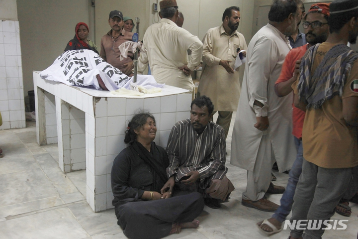 [카라치=AP/뉴시스] 지난달 31일(현지시간) 파키스탄 카라치의 한 공장 밖 라마단 음식 무료 배급소에서 압사 사고가 발생해 숨진 희생자의 가족이 시신 안치소에 주저앉아 흐느끼고 있다. 이 사고로 어린이 3명과 여성 8명 등 지금까지 최소 11명이 숨진 것으로 나타났다. 2023.04.01.