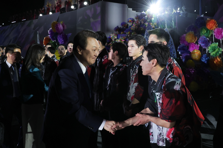 [순천=뉴시스] 윤석열 대통령이 지난 31일 전남 순천 순천만국가정원에서 열린 2023 순천만국제정원박람회 개막식에서 공연자들을 격려하고 있다. (사진=대통령실 제공) 2023.04.01. [email protected] *재판매 및 DB 금지