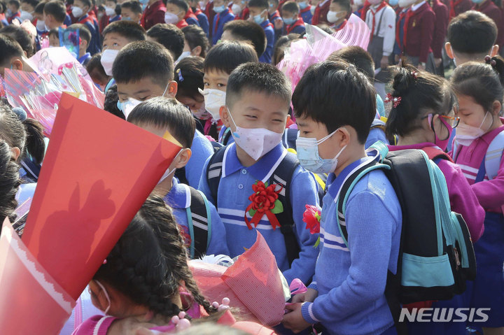 [평양=AP/뉴시스] 1일 북한 평양 모란봉 지구의 한 초등학교에서 열린 입학식에 참석한 신입생들이 웃으며 얘기를 나누고 있다. 이날 북한의 '주체112' 새 학년이 시작됐다. 주체112는 김일성 전 주석이 태어난 지 112년이 된 해라는 의미로 2023년을 의미한다. 2023.04.02.