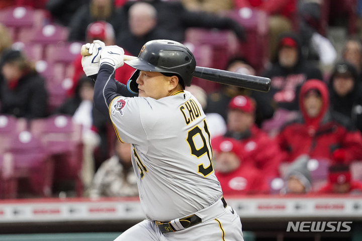[신시내티=AP/뉴시스] 피츠버그 파이어리츠의 최지만이 1일(현지시간) 미 오하이오주 신시내티의 그레이트 아메리칸 볼파크에서 열린 2023 메이저리그(MLB) 신시내티 레즈와의 경기 9회 초 2사 후 대타로 나와 타격하고 있다. 최지만은 우익수 직선타로 물러났으며 팀은 2-6으로 패했다. 2023.04.02.