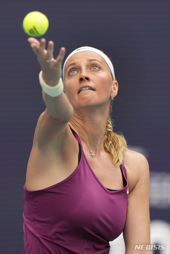[마이애미=AP/뉴시스] 페트라 크비토바(12위·체코)가 1일(현지시간) 미 플로리다주 마이애미 가든스에서 열린 여자프로테니스(WTA) 투어 마이애미오픈 단식 결승에서 엘레나 리바키나(7위·카자흐스탄)와 경기하고 있다. 크비토바는 리바키나를 2-0<7-6<16-14> 6-2)으로 꺾고 마스터스 1000 시리즈 통산 9번째 우승컵을 들어 올렸다. 2023.04.02.