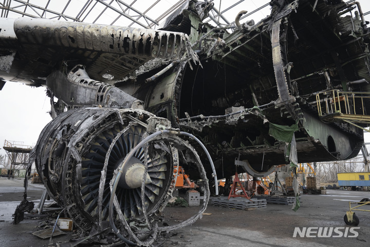 [호스토멜=AP/뉴시스] 1일(현지시간) 우크라이나 키이우 외곽 호스토멜의 안토노프 공항에 지난해 러시아의 공습으로 파괴된 세계 최대의 화물기 안토노프 225(An-225) '므리야'의 잔해가 보인다. 우크라이나가 An-225의 복원 작업을 본격화하면서 그 필요성을 놓고 논란이 일고 있다. 2023.04.02.