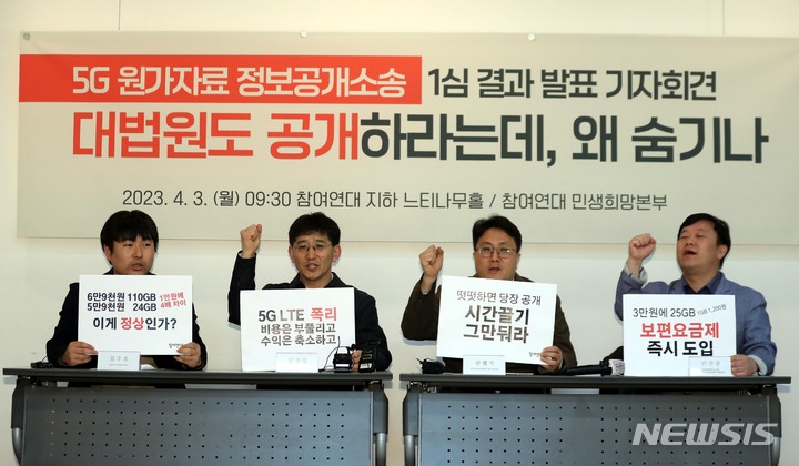 참여연대 민생희망본부는 이날 기자회견에서 ‘5G 원가자료 즉시 공개’, ‘보편요금제 도입과 LTE 요금인하’, ‘요금인가제 재도입과 검증시스템 강화’를 촉구했다.2023.04.03. [email protected]