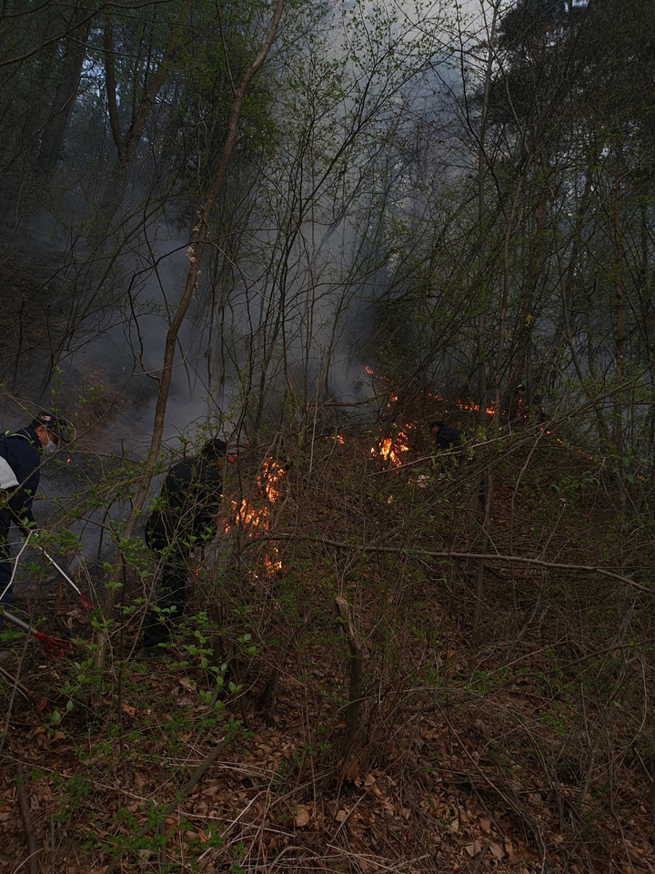 [순천=뉴시스] 김석훈 기자 =4일 오전 소방린력이 전남 순천시 송광면 야산의 산불을 끄기 위한 진화작업을 하고 있다. (사진=독자 제공). 2023.04.04. [email protected]