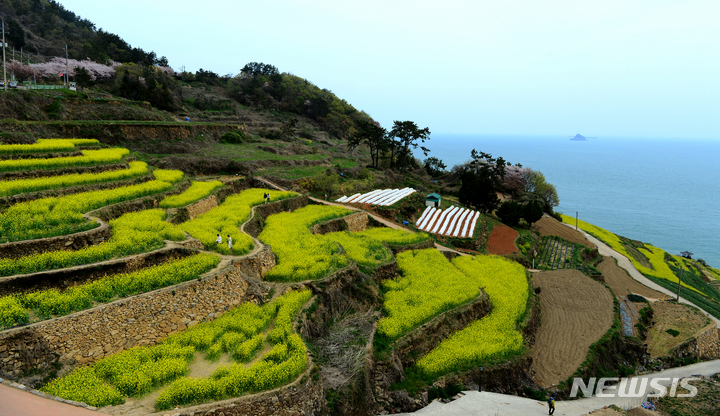 [남해=뉴시스] 차용현 기자 = 4일 오후 경남 남해군 남면 다랭이마을 다랭이논에 노란 유채꽃이 피어 봄의 정취를 더하고 있다. 2023.04.04. [email protected]