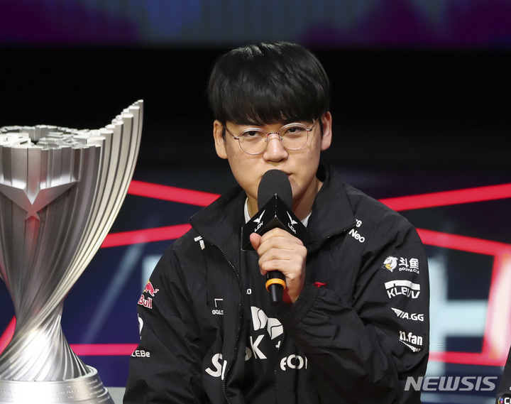 [서울=뉴시스] 김근수 기자 = T1 구마유시 이민형 선수가 4일 오후 서울 종로구 LCK 아레나에서 열린 '2023 ‘LoL 챔피언스 코리아(LCK)’ 스프링 시즌 결승전 미디어데이'에서 각오를 말하고 있다. 2023.04.04. [email protected]
