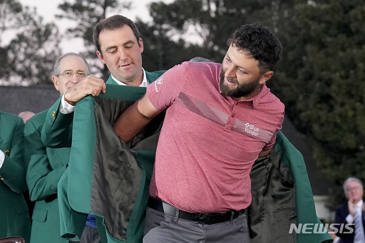 [오거스타=AP/뉴시스] 욘 람(스페인)이 9일(현지시간) 미 조지아주 오거스타의 오거스타 내셔널 GC에서 열린 미국프로골프(PGA) 투어 제87회 마스터스 토너먼트 정상에 올라 우승의 상징인 그린 재킷을 입고 있다. 람은 최종 합계 12언더파 276타로 브룩스 켑카(미국)에 역전하며 우승, PGA 통산 11승을 기록했다. 2023.04.10.