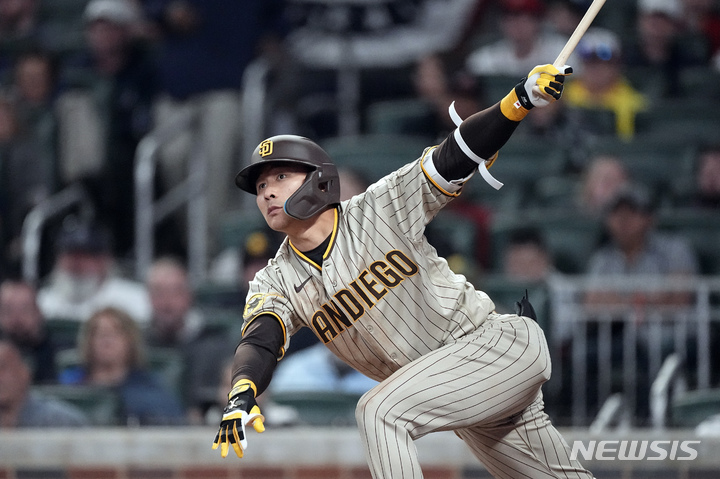 [애틀랜타=AP/뉴시스] 샌디에이고 파드리스의 김하성이 9일(현지시간) 미 조지아주 애틀랜타의 트루이스트 파크에서 열린 2023 메이저리그 애틀랜타 브레이브스와의 경기 5회 초 2점 홈런을 치고 있다. 김하성은 7회 경기가 진행 중인 현재 3타수 2안타 3타점 1득점 1볼넷의 활약을 펼치고 있으며 팀은 10-1로 앞서고 있다. 2023.04.10.