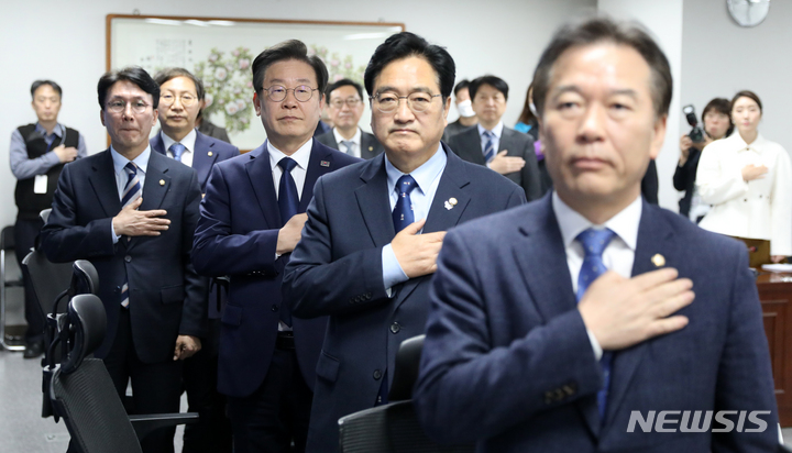 [서울=뉴시스] 고범준 기자 = 이재명 더불어민주당 대표, 우원식 더불어민주당 기본사회위원회 수석부위원장 등 참석자들이 13일 오전 서울 여의도 국회 의원회관에서 열린 '윤석열 정부 1년 평가 연속토론회' 무너진 1년, 위기의 대한민국 제1차 경제 무너진 삶, 캄캄한 미래에서 국민의례를 하고 있다. 2023.04.13. [email protected]