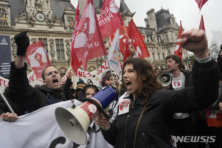 [파리=AP/뉴시스] 14일(현지시간) 프랑스 파리 시청사 앞에서 연금 개혁 반대 시위대가 구호를 외치고 있다. 프랑스 헌법위원회가 에마뉘엘 마크롱 대통령이 추진한 연금 개혁안의 핵심 내용인 정년을 64세로 연장하는 조항을 합헌으로 인정했고 야당과 노동단체는 즉각 반발했다. 2023.04.15.