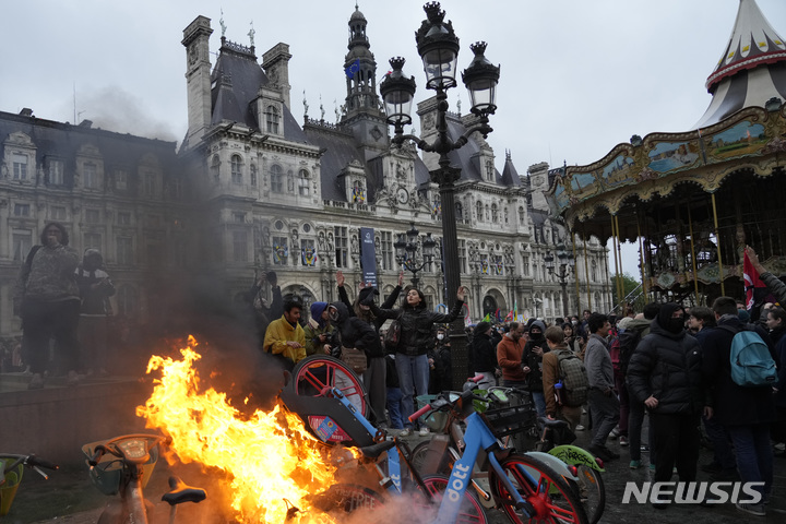 [파리=AP/뉴시스] 14일(현지시간) 프랑스 파리 시청사 앞에서 연금 개혁 반대 시위대가 자전거들을 불에 태우고 있다. 프랑스 헌법위원회가 에마뉘엘 마크롱 대통령이 추진한 연금 개혁안의 핵심 내용인 정년을 64세로 연장하는 조항을 합헌으로 인정했고 야당과 노동단체는 즉각 반발했다. 2023.04.15.