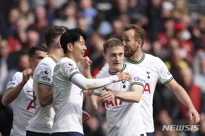 [런던=AP/뉴시스] 토트넘 홋스퍼의 손흥민이 15일(현지시간) 영국 런던의 토트넘 홋스퍼 스타디움에서 열린 2022-23 잉글리시프리미어리그(EPL) 본머스와의 31라운드 경기 전반 14분 선제골(리그 8호)을 넣고 동료들과 기쁨을 나누고 있다. 토트넘은 후반 추가시간 실점하며 2-3으로 패했다. 2023.04.16.