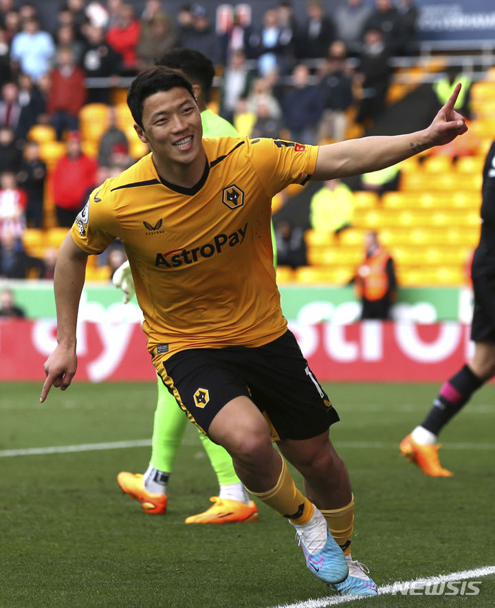 [울버햄프턴=AP/뉴시스] 울버햄프턴 원더러스의 황희찬이 15일(현지시간) 영국 울버햄프턴의 몰리뉴 스타디움에서 열린 2022-23 잉글리시프리미어리그(EPL) 31라운드 브렌트퍼드와 경기 후반 24분 팀의 두 번째 골을 넣고 기뻐하고 있다. 황희찬은 교체 출전 5분 만에 쐐기 골을 넣으며 팀의 2-0 승리를 이끌었다. 2023.04.16.