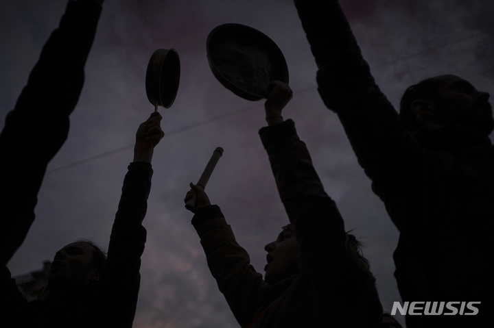 [리옹=AP/뉴시스] 에마뉘엘 마크롱 프랑스 대통령이 17일(현지시간) 연금 개혁과 관련해 TV를 통한 대국민 연설을 하는 동안 리옹에서 시위대가 냄비와 프라이팬을 두드리고 있다. 마크롱 대통령은 정년을 62세에서 64세로 올린 데 대한 국민의 분노를 들었다면서도 이는 필요한 개혁이었다고 말했다. 이에 프랑스 8개 주요 노조는 "대통령이 여전히 국민의 분노를 이해하지 못하고 있다"라며 "5월 1일 프랑스 전역에서 국민의 진짜 분노를 들려주겠다"라고 경고했다. 2023.04.18.