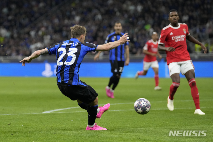 [밀라노=AP/뉴시스] 인테르 밀란의 니콜로 바렐라가 19일(현지시간) 이탈리아 밀라노의 산시로 경기장에서 열린 2022~23 유럽축구연맹(UEFA) 챔피언스리그(UCL) 벤피카(포르투갈)와의 8강 2차전 전반 14분 선제골을 넣고 있다. 인테르는 3-3 무승부를 기록해 1, 2차전 합계 5-3으로 앞서며 4강에 올랐다. 2023.04.20.