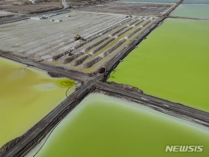 [아타카마=AP/뉴시스] 지난 18일(현지시간) 칠레 아타카마 사막의 리튬 기업 SQM 광산에서 트럭 한 대가 리튬을 처리하는 염수 웅덩이 사이를 지나고 있다. 가브리엘 보리치 칠레 대통령이 20일 리튬 산업을 국유화한다고 발표하면서 리튬 계약은 국가 통제 속 공공-민간 파트너십으로만 이루어지게 됐다. 칠레는 세계 1위 리튬 매장국이자 세계 2위 리튬 생산국이다. 2023.04.21.