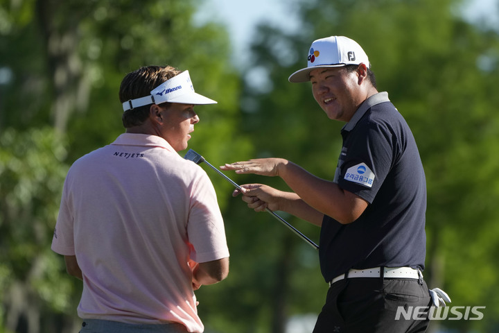 [애번데일=AP/뉴시스] 임성재가 21일(현지시간) 미 루이지애나주 애번데일의 TPC 루이지애나에서 열린 미국프로골프(PGA) 투어 취리히 클래식 2라운드 15번 그린에서 키스 미첼(미국)과 얘기를 나누고 있다. 임성재는 미첼과 조를 이뤄 포섬 방식으로 진행된 2라운드 중간 합계 15언더파 129타 공동 2위를 기록했다. 2023.04.22.