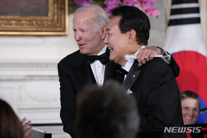 [워싱턴=AP/뉴시스] 조 바이든 미국 대통령이 26일(현지시간) 백악관에서 열린 국빈만찬을 마친 후 미국의 싱어송라이터 돈 맥클린의 '아메리칸 파이'를 부른 윤석열 대통령과 어깨동무를 하고 있다. 2023.04.27.