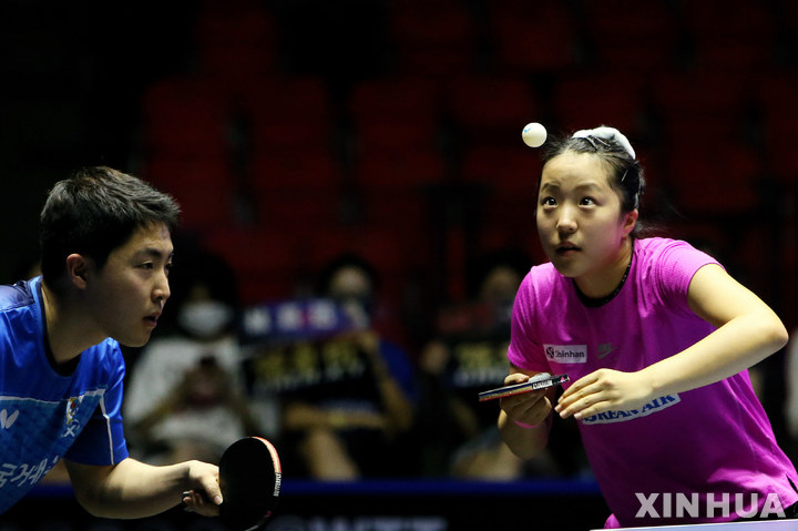 [방콕=AP/뉴시스] 임종훈-신유빈이 28일(현지시간) 태국 방콕에서 열린 월드테이블테니스(WTT) 스타 컨텐더 방콕 2023 대회 혼합복식 결승에서 린가오위엔-첸싱통(중국) 조와 경기하고 있다. 한국은 세트 스코어 2-3(11-7 11-9 9-11 6-11 8-11)으로 역전패하며 준우승을 차지했다. 2023.04.29.
