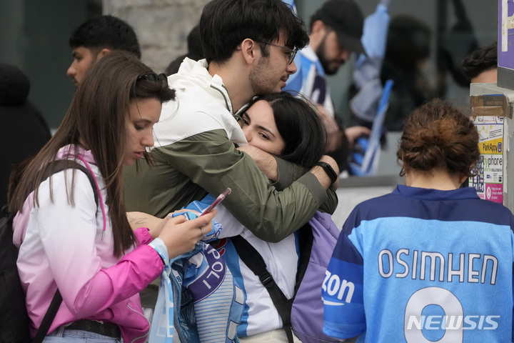 [나폴리=AP/뉴시스] 지난달 30일(현지시간) 이탈리아 나폴리에서 나폴리 축구팬들이 나폴리의 세리에A 우승이 불발되자 아쉬워하고 있다. 나폴리는 이날 디에고 아르만도 마라도나 경기장에서 열린 2022~23 세리에 A 축구 32라운드 셀레르니타나와 1-1로 비겨 33년 만의 우승을 뒤로 미루게 됐다. 2023.05.01.
