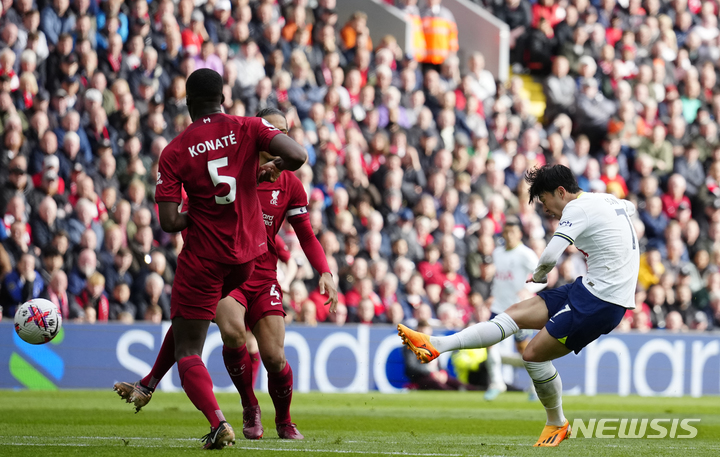 [리버풀=AP/뉴시스] 토트넘 홋스퍼의 손흥민이 지난달 30일(현지시간) 영국 리버풀의 안필드에서 열린 2022~023 잉글랜드 프로축구 프리미어리그(EPL) 34라운드 리버풀과의 경기 후반 32분 팀의 두 번째 골(리그 10호)을 넣고 있다. 손흥민은 1골 1도움에 7시즌 연속 두 자릿수 득점을 기록했고 팀은 3-4로 패했다. 2023.05.01.