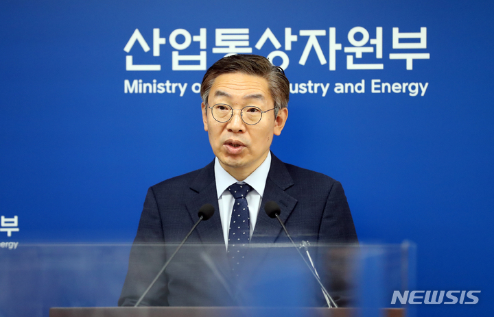 [세종=뉴시스] 강종민 기자 = 김완기 산업통상자원부 무역투자실장이 1일 세종시 정부세종청사에서 2023년 4월 수출입 동향을 발표하고 있다. 지난달 수출이 1년 전보다 14.2% 감소한 496억2000만 달러(66조5404억원)를 기록한 것으로 나타났다. 2023.05.01. [email protected]