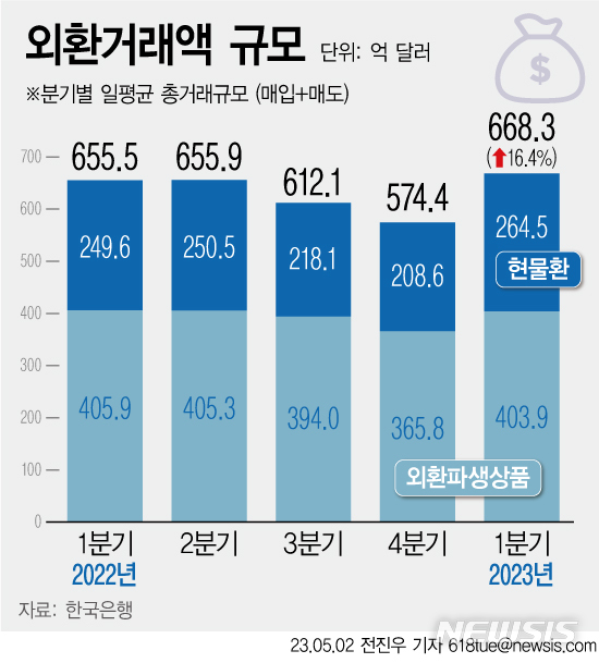 [서울=뉴시스] 2일 한국은행에 따르면 올해 1분기 외국환은행의 일 평균 현물환·외환파생상품 등 외환거래 규모는 668억3000만 달러로 전분기 대비 16.4%(94억 달러) 늘었다. 이는 해당 통계가 작성된 2008년 이후 최대치를 기록했다. (그래픽=전진우 기자)