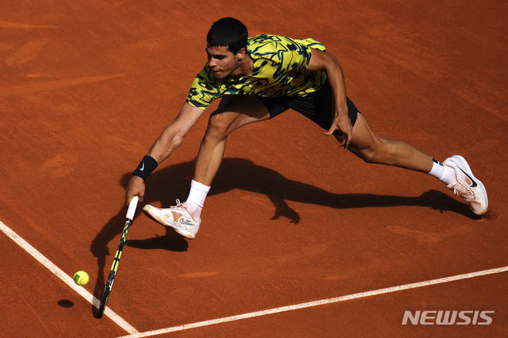 [마드리드=AP/뉴시스] 카를로스 알카라스(2위·스페인)가 3일(현지시간) 스페인 마드리드에서 열린 남자프로테니스(ATP) 투어 무투아 마드리드 오픈 단식 8강전에서 카렌 카차노프(12위·러시아)와 경기하고 있다. 알카라스가 세트 스코어 2-0(6-4 7-5)으로 승리하고 4강에 올랐다. 2023.05.04.
