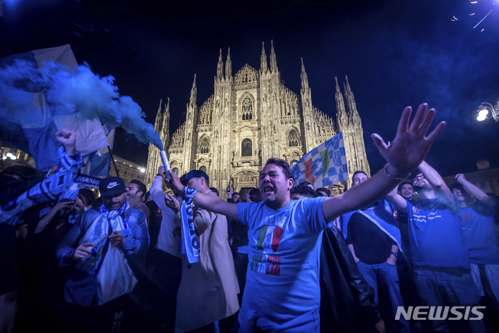 [나폴리=AP/뉴시스] 4일(현지시간) 이탈리아 나폴리에서 축구 팬들이 나폴리의 우승에 환호하고 있다. SSC 나폴리는 2022-23 세리에A 33라운드 우디네세와의 원정 경기에서 1-1로 비기며 33년 만에 우승을 차지했다. 2023.05.05.