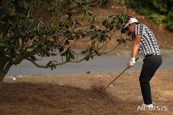 [샬럿=AP/뉴시스] 이경훈이 5일(현지시간) 미 노스캐롤라이나주 샬럿의 퀘일 할로 클럽에서 열린 미국프로골프(PGA) 투어 웰스파고 챔피언십 2라운드 9번 홀 덤불에서 샷하고 있다. 첫날 공동 2위였던 이경훈은 9번 홀에서 더블 보기를 범하며 중간합계 6언더파 136타 공동 10위로 내려앉았다. 2023.05.06.