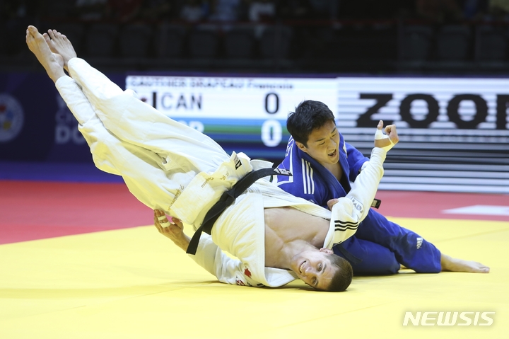 [도하=AP/뉴시스] 이준환(오른쪽)이 10일(현지시각) 카타르 도하에서 열린 세계유도선수권대회 남자 -81㎏급 동메달 결정전에서 고티에 프랑수아(캐나다)와 경기하고 있다. 이준환은 업어치기 한판으로 프랑수아를 꺾고 처음으로 세계선수권 동메달을 목에 걸었다. 2023.05.11.