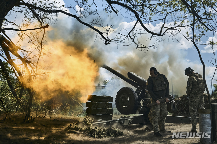 [바흐무트=AP/뉴시스] 12일(현지시각) 우크라이나 도네츠크주의 격전지 바흐무트 인근에서 우크라이나 군인들이 대포를 발사하고 있다. 2023.05.13.