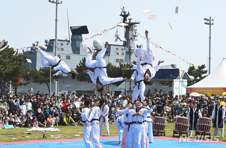 [평택=뉴시스] 김종택 기자 = 제1회 평택해양페스티벌이 열린 지난 13일 경기도 평택시 해군2함대사령부 야외공연장에서 육군 지상작전사령부 태권도 시범단이 송판 격파를 하고 있다. 이날 행사에는 대한민국 해양을 수호하는 핵심전력인 독도함·인천함·서울함 공개행사와 해군/해병대 기동장비 전시, 각종 체험관, 축하 공연 등 다채로운 행사가 펼쳐졌다. 2023.05.14. [email protected]