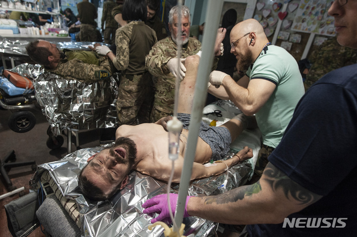 [바흐무트=AP/뉴시스] 14일(현지시각) 우크라이나 도네츠크주 바흐무트 인근 한 의료소에서 군 의료진이 우크라이나 부상 군인들을 응급처치하고 있다. 2023.05.15.