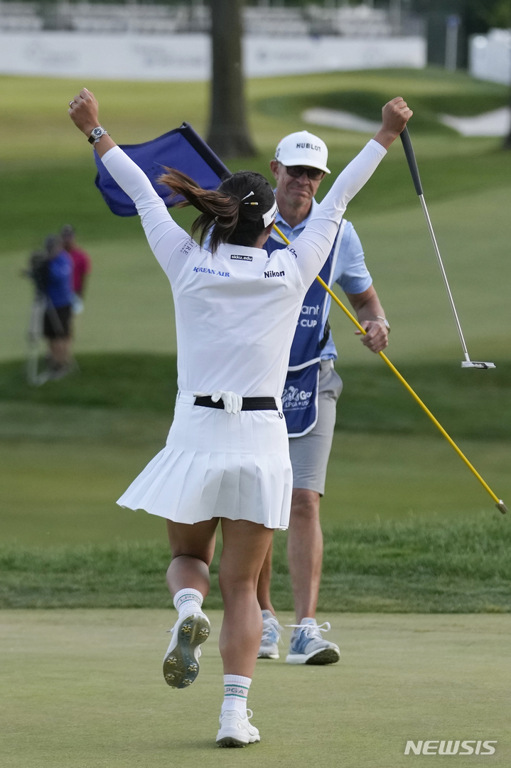 [클리프턴=AP/뉴시스] 고진영이 14일(현지시각) 미 뉴저지주 클리프턴의 어퍼 몽클레어 CC에서 열린 미국여자프로골프(LPGA)투어 코그니전트 파운더스컵에서 우승하며 캐디 데이비드 브루커에게 달려가고 있다. 고진영은 최종 합계 13언더파 275타로 지난해 우승자 이민지(호주)와 동타를 이뤄 연장 끝 우승을 차지했다. 고진영은 시즌 2승, 통산 15승을 기록했다. 2023.05.15.