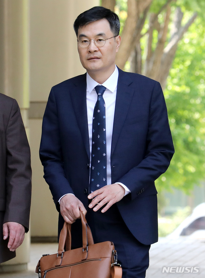 [서울=뉴시스] 조성우 기자 = 고(故) 이예람 중사 사건 수사에 불법 개입한 혐의로 기소된 전익수 전 공군본부 법무실장이 15일 오전 서울 서초구 서울중앙지방법원에서 열린 공판에 출석하고 있다. 2023.05.15. [email protected]