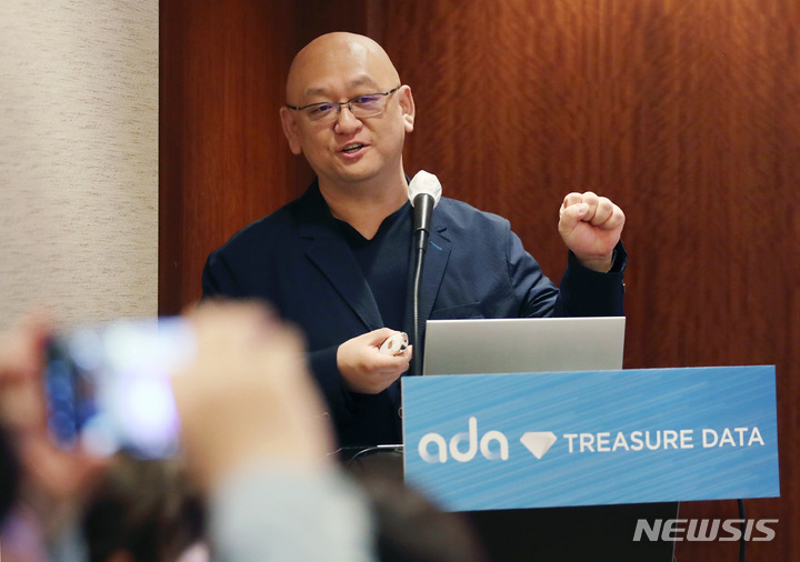[서울=뉴시스] 김진아 기자 = 고영혁 ADA 코리아 대표이사가 16일 서울 강남구 그랜드 인터컨티넨탈 서울 파르나스에서 열린 '트레저데이터코리아'와 'ADA코리아'의 전략적 합병 단행 기자회견에서 발표를 하고 있다.