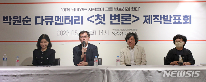 [서울=뉴시스] 김금보 기자 = 16일 오후 서울 중구 컨퍼런스하우스달개비에서 박원순 다큐멘터리 <첫 변론> 제작발표회가 열리고 있다. 2023.05.16. [email protected]