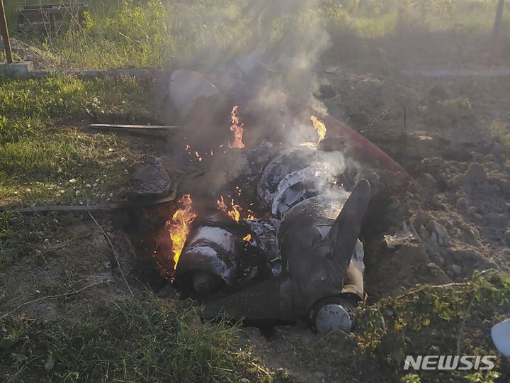 [키이우=AP/뉴시스] 18일(현지시각) 우크라이나 키이우에 우크라이나 방공망이 격추한 러시아 로켓 잔해가 불에 타고 있다. 우크라이나 총참모부는 "러시아군이 밤사이 미사일 공격을 했으며 미사일 30발 중 29발, 자폭 드론과 정찰 드론 각 2기를 격추했다"라고 밝혔다. 2023.05.19.