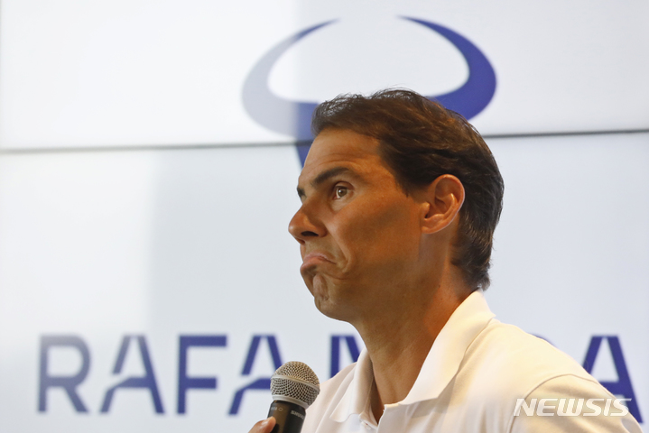 [마요르카=AP/뉴시스] 라파엘 나달(14위·스페인)이 18일(현지시각) 스페인 마요르카의 나달 테니스 아카데미에서 기자회견 하고 있다. 나달은 엉덩이 근육 부상으로 오는 22일 개막하는 프랑스 오픈에 출전하지 않을 것이며 2024년 시즌을 끝으로 은퇴한다고 밝혔다. 2023.05.19.