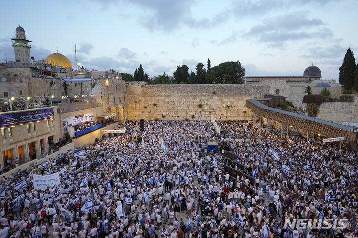 [예루살렘=AP/뉴시스] 이스라엘 사람들이 18일(현지시각) 예루살렘 구시가지에서 가장 신성한 장소인 통곡의 벽 주변에 모여 국기를 들고 '예루살렘의 날'을 기념하고 있다. 이날 수천 명의 이스라엘 사람이 1967년 이스라엘이 중동 전쟁에서 동예루살렘을 점령한 '예루살렘의 날'을 기념해 국기 행진을 펼쳤다. 2023.05.19.